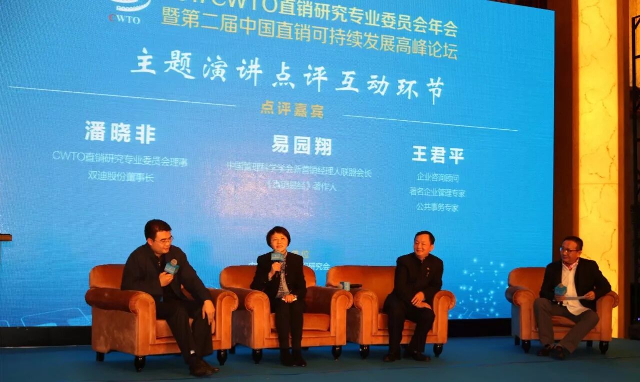 在30日下午举行的主题演讲点评互动环节中,董事长潘晓非(左二)作为特邀嘉宾,应邀对汤用彤书院中医文化研究院副院长陈大为《实体虚拟论——中国直销业体验式经营解析》专题演讲进行点评,共同探讨“文化引导、知识营销和体验服务”等问题,为直销企业线下实体发展提供更多参考借鉴。