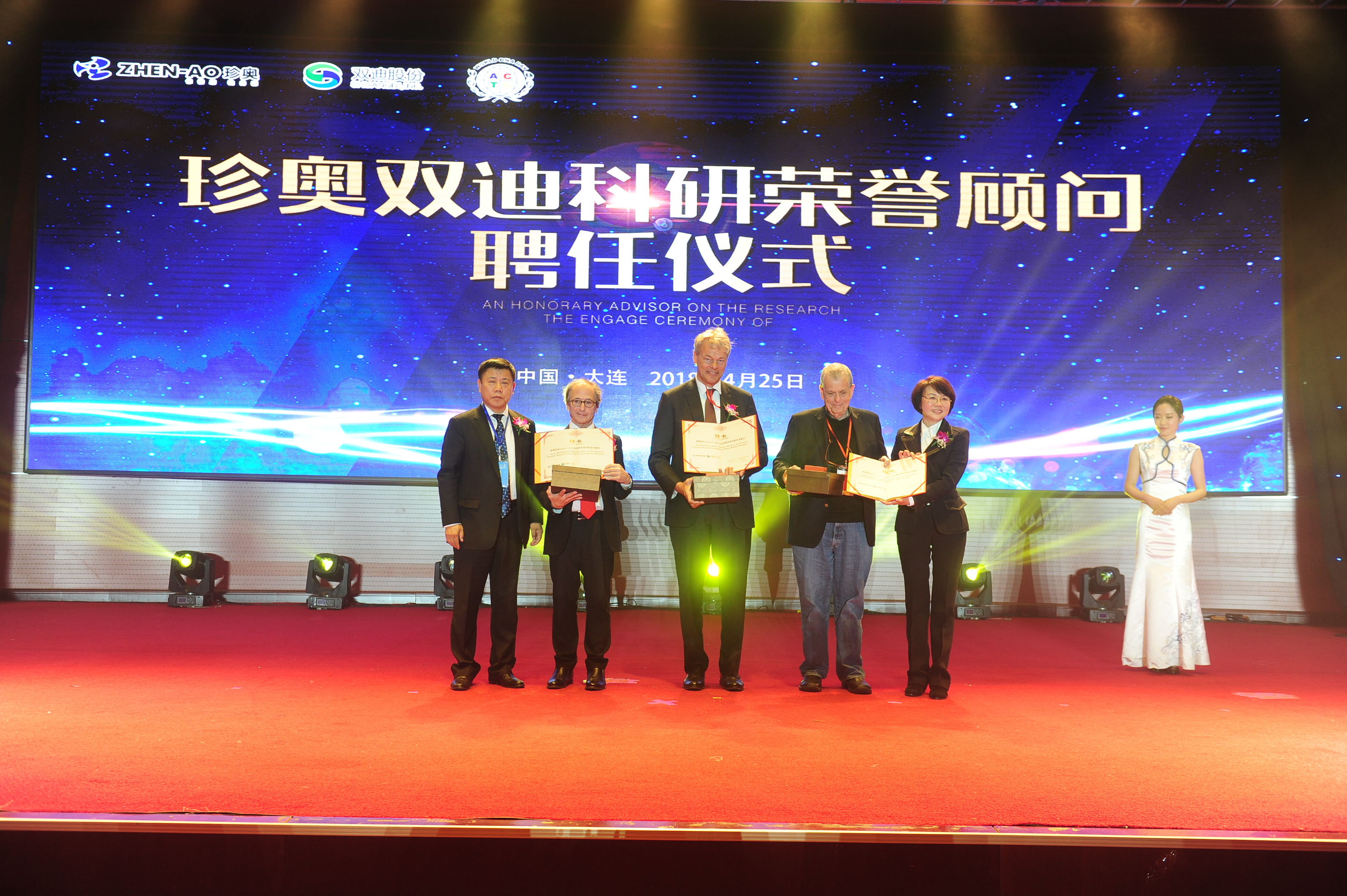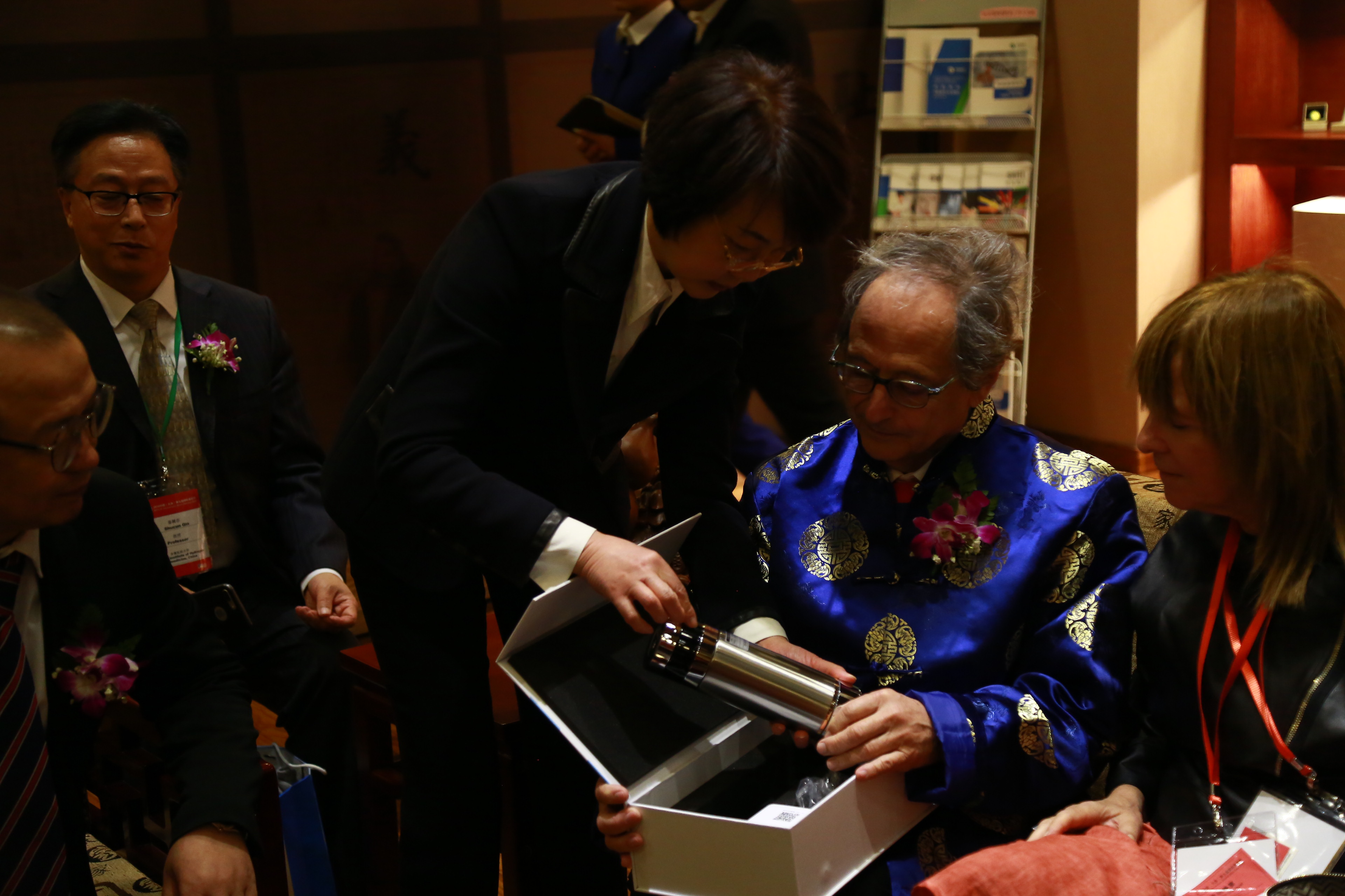 陈玉琦董事长郑重地为三位诺奖大师颁发珍奥、双迪科研荣誉顾问科研荣誉顾问聘书,潘晓非董事长向诺奖科学家赠送饱含中国文化元素的双迪司徽和字币礼盒和珠联璧合玉器。相信有世界顶级科学家的宝贵智力支持,双迪产品、技术、服务的科技之光将更加耀眼!