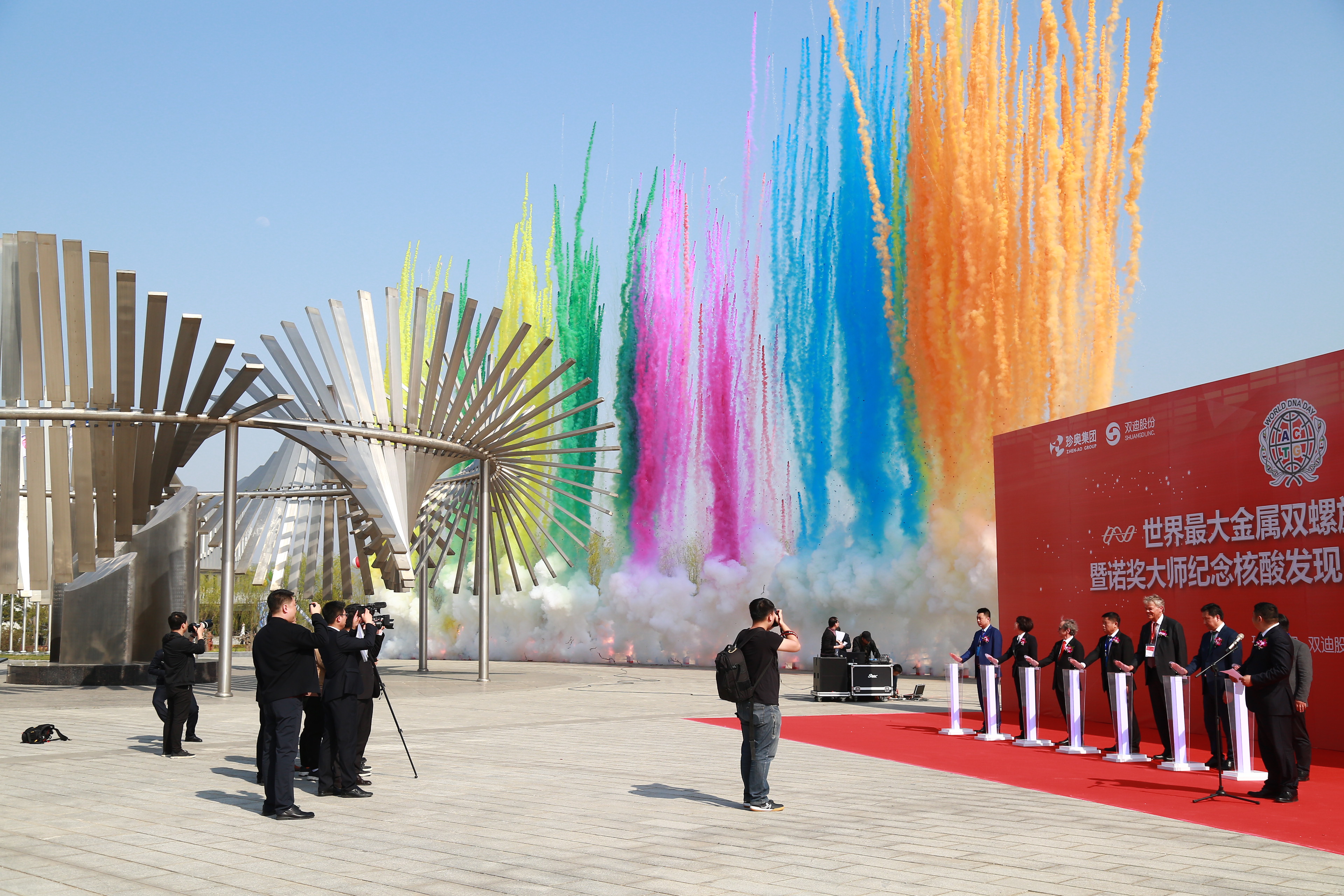 在生物谷诺贝尔广场双螺旋雕塑前,诺奖大师与珍奥、双迪领导共同为“核酸发现150周年暨DNA修复细胞机制获诺贝尔奖3周年庆典”揭幕。