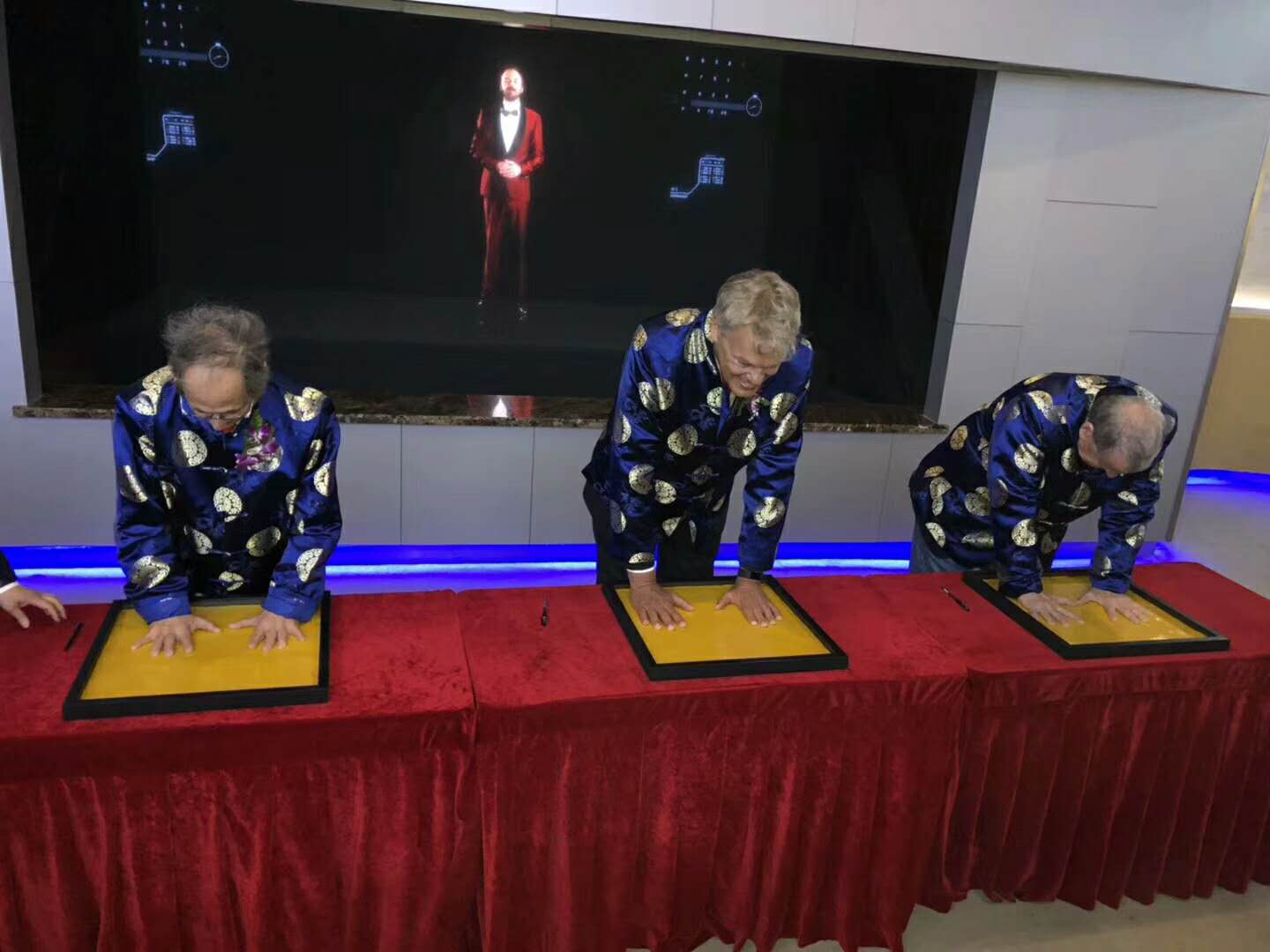 在诺奖名人堂展厅,三位诺贝尔奖科学家欣然接受邀请,留下自己的手模,中外专家还分别现场书写寄语,对公司和发展前景表达赞许和祝福。