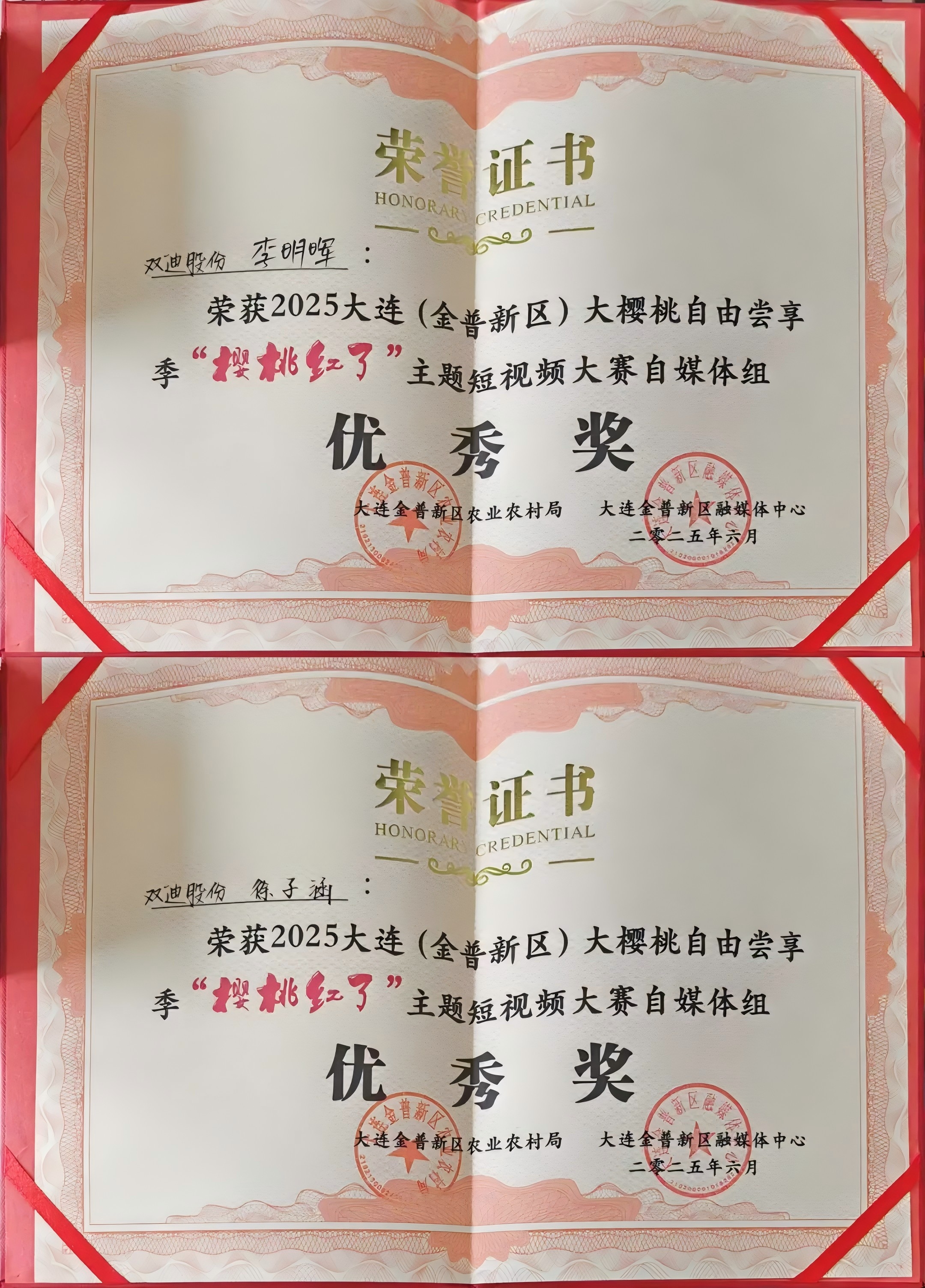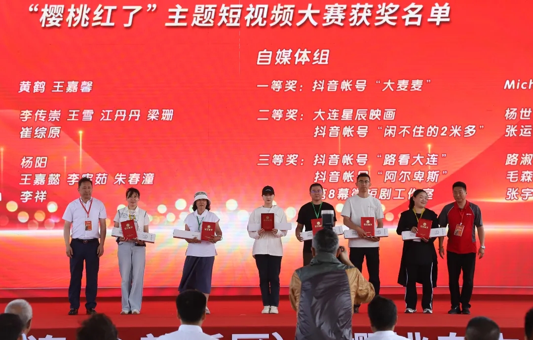 本次活动期间还举办了“樱桃红了”主题短视频大赛。6月18日,开幕式上,双迪股份董事长刘洪(左一)作为颁奖嘉宾,为“樱桃红了”主题短视频大赛获奖创作者颁发荣誉证书及双迪健康礼包。